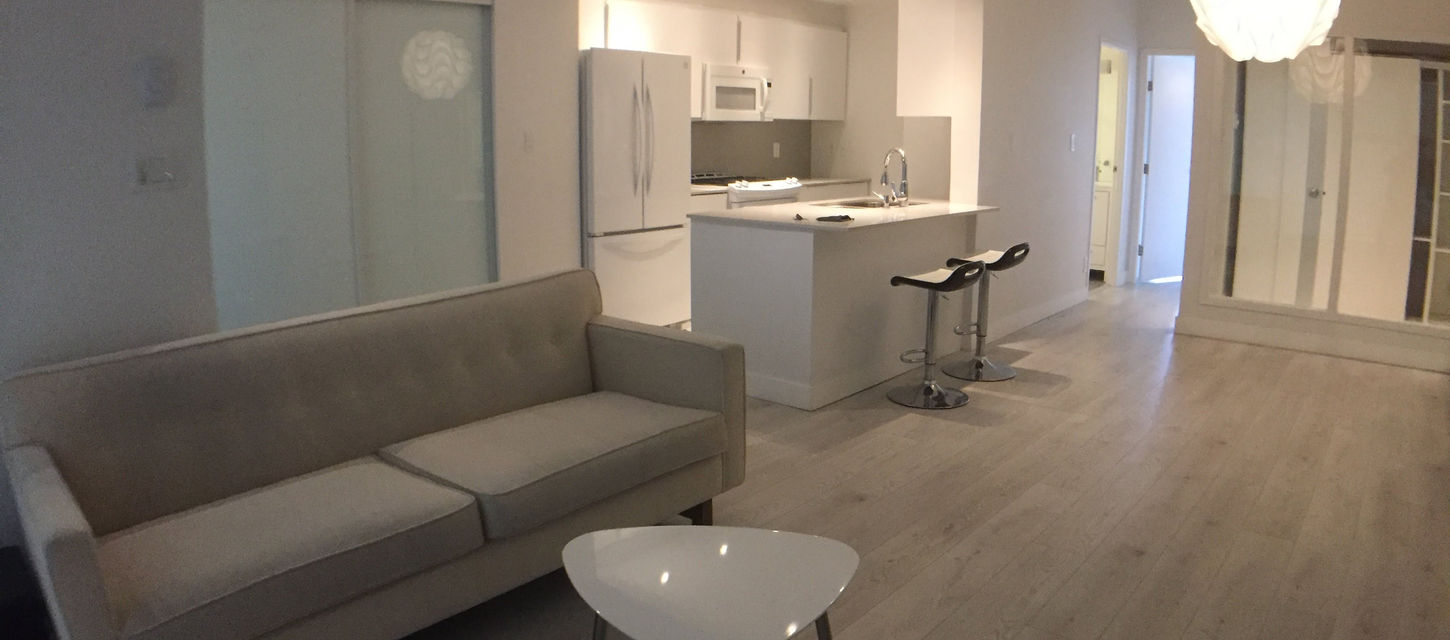 Contemporary furnished condo for rent at Marinaside Resort. With giant floor to ceiling windows on both sides, and lined with gorgeous hardwood flooring throughout, this open concept suite is incredibly bright and airy the moment you walk in. The living space is accentuated by a gas fireplace and furnished with a stylish grey couch with matching chaise lounge and flat screen TV on a swiveling wall mount.